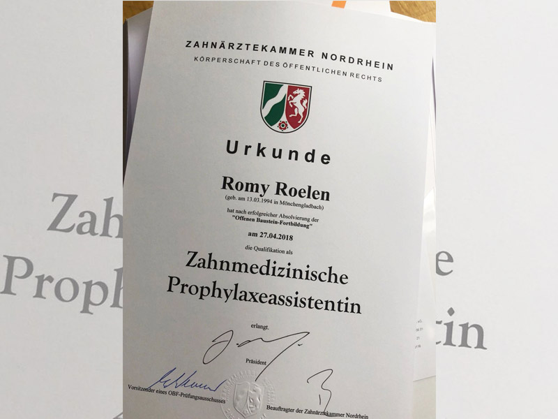 Unsere Mitarbeiterin Romy Roelen hat die Abschlussprüfung zur Zahnmedizinischen Prophylaxeassistentin (ZMP) bestanden. Damit hat sie die anspruchsvolle Aufstiegsfortbildung am Karl-Häupl-Institut in Düsseldorf erfolgreich abgeschlossen. Das gesamte Team freut sich mit Frau Roelen und gratuliert ihr ganz herzlich!
